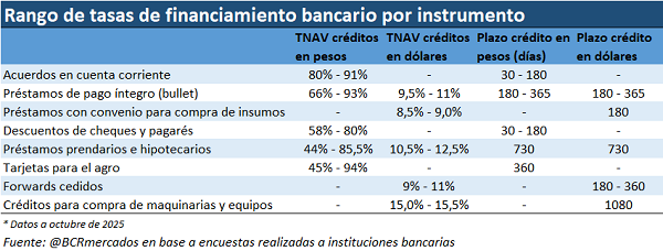 El análisis también aborda instrumentos financieros ofrecidos por el Mercado Argentino de Valores (MAV) y por el sector comercial / proveedores. En pesos, el MAV dispone de pagarés avalados o directos, cheques de pago diferido, e‑cheqs y facturas de crédito electrónicas, con plazos hasta tres años. En dólares, el MAV también ofrece pagarés avalados y directos, siendo el segmento con garantía el que tiende a menores tasas. Desde el sector comercial se relevó que las tasas en dólares rondan el 0,5 % mensual (alrededor de 6 % anual) cuando se acompaña de instrumentos como contratos forward o pago en especie. Para compra de insumos, el financiamiento de proveedores podría ubicarse entre 8,5 % y 10,0 % anual en dólares, en operaciones garantizadas con forward. Estas vías permiten diversificar fuentes de crédito, aunque su volumen es menor y están sujetas a garantías o condiciones específicas.