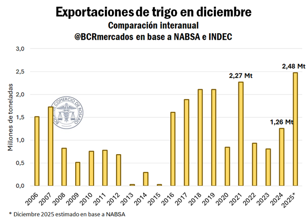 La campaña de trigo 2025/26 en Argentina comenzó con números extraordinarios: en diciembre se estima que se exportaron 2,48 millones de toneladas, una cifra que duplica lo enviado en el mismo mes del año pasado y supera el récord anterior de diciembre de 2021, que fue de 2,3 millones.
