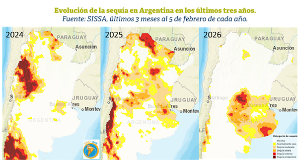 Como se observa en los mapas, si bien a esta misma altura del año pasado la región pampeana atravesaba un escenario de sequía, en la mayor parte del área la situación estaba categorizada como “sequía moderada”. Los focos más severos se concentraron en un período relativamente acotado, durante la segunda quincena de enero, principalmente en el noreste de Buenos Aires y el centro-sur de Entre Ríos, para luego disiparse con rapidez tras las primeras lluvias de febrero.