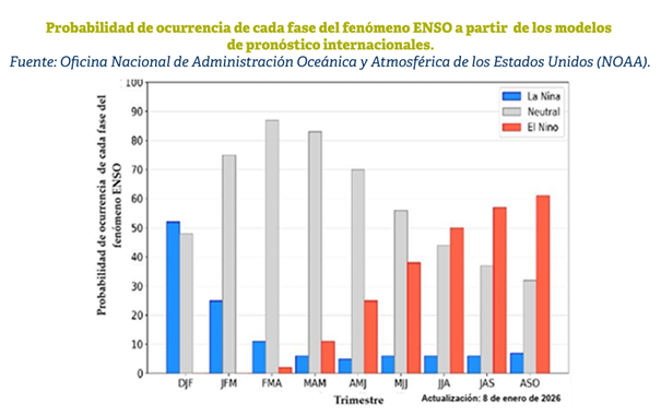 Por otra parte, a diferencia de años anteriores, los principales modelos climáticos que monitorean el fenómeno ENSO, indican que las condiciones de La Niña continúan debilitándose, y se espera que se disipen hacia el mes de marzo. Aunque sus efectos todavía se registran tanto en el océano como en la atmósfera, la probabilidad de que persista durante el resto del verano se ha reducido al 20%. En cambio, aumenta la probabilidad de transición hacia condiciones neutrales a partir del trimestre febrero-abril, que se mantendrían hasta mediados del invierno.