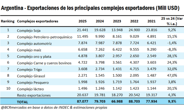 En lo referido al año 2025, la mayor parte de los complejos exportadores creció en valor exportado salvo Complejo Maíz (-8,3% i.a.) y Complejo Automotriz (↓1,4% i.a.). Respecto a los complejos que más crecieron, lideran el podio Complejo Girasol (↑47,0% i.a.), Complejo Oro y Plata (↑28,1% i.a.) y Complejo Carne y Cueros Bovinos (↑24,3% i.a.).