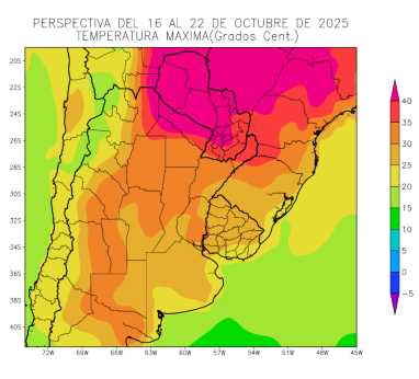 La segunda semana, del 23 al 29 de octubre, comenzaría con calor intenso en el interior de la región, aunque el Litoral Atlántico conserva temperaturas normales. Posteriormente, el paso de un nuevo frente de tormenta generaría precipitaciones generales de variada intensidad. Se esperan focos de tormentas sobre el norte de la Región Pampeana y zonas aledañas.