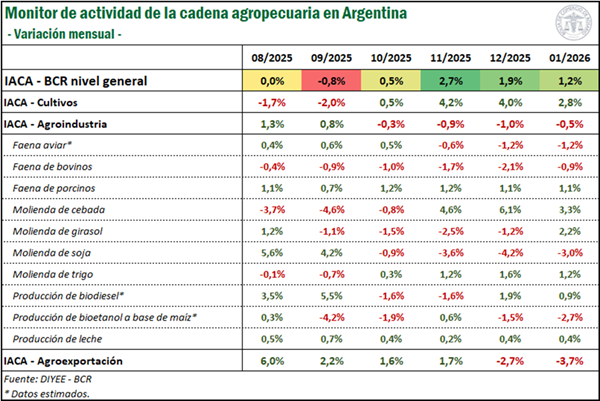 La cadena agropecuaria argentina comenzó el año con números récord. Así lo indicó el último relevamiento de la Bolsa de Comercio de Rosario, que informó que el Índice de Actividad de la Cadena Agropecuaria (IACA) creció 1,2% en enero respecto de diciembre y se ubicó 13,3% por encima del mismo mes del año pasado.