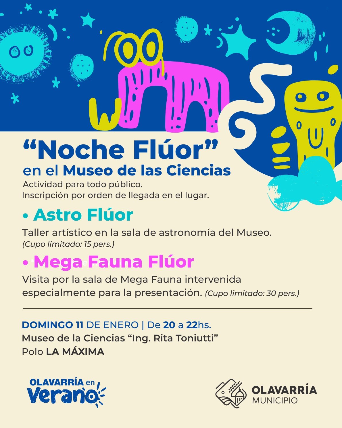 En la ocasión se brindarán dos talleres que funcionarán en simultáneo, abordando temáticas típicas del espacio. Será, por un lado, la Megafauna flúor, que consistirá en una visita a la la sala de Megafauna, que estará intervenida especialmente para la presentación.