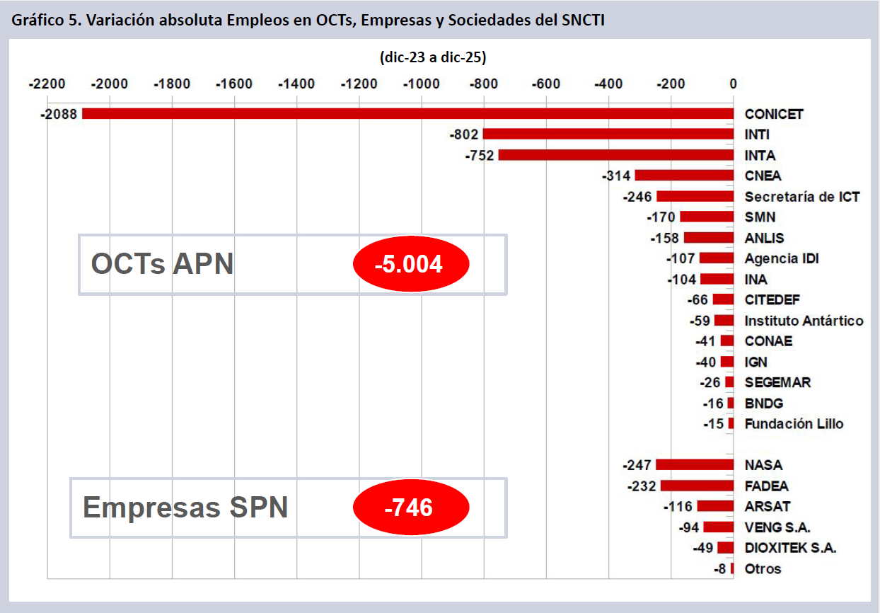 En particular, el informe señala que 5.004 puestos de trabajo perdidos corresponden a organismos de ciencia y tecnología dependientes de la Administración Pública Nacional, mientras que 746 son puestos que se perdieron en empresas del Sistema Público Nacional. Con más detalle, el Grupo EPC-CIICTI explicó que “más del 40% de ese subtotal se dio en el ámbito del CONICET, mientras que se destaca la destrucción de empleo en el INTI, el INTA y otros organismos centrales para la ciencia nacional”.