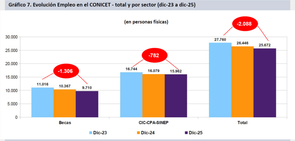 A su vez, en el informe se señala con particular atención la situación del CONICET. A lo largo de los últimos dos años, en el organismo se perdieron 1.306 becas y 782 puestos de investigadores de carrera. En total, se trata de 2.088 cargos menos que en diciembre de 2023.