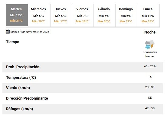 Para la noche del martes, el SMN prevé una probabilidad de precipitación entre 40 y 70%, con temperaturas cercanas a los 15°C y vientos del sudeste de 23 a 31 km/h, con ráfagas que podrían alcanzar los 50 km/h.