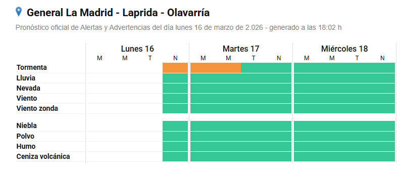 El Servicio Meteorológico Nacional (SMN) actualizó durante la tarde de este lunes el alerta naranja por tormentas para el centro de la provincia de Buenos Aires, lo que incluye a Olavarría y a los distritos vecinos. El fenómeno se desarrollaría principalmente entre la noche de hoy y la madrugada del martes, con condiciones que podrían presentar intensidad significativa en algunos momentos.