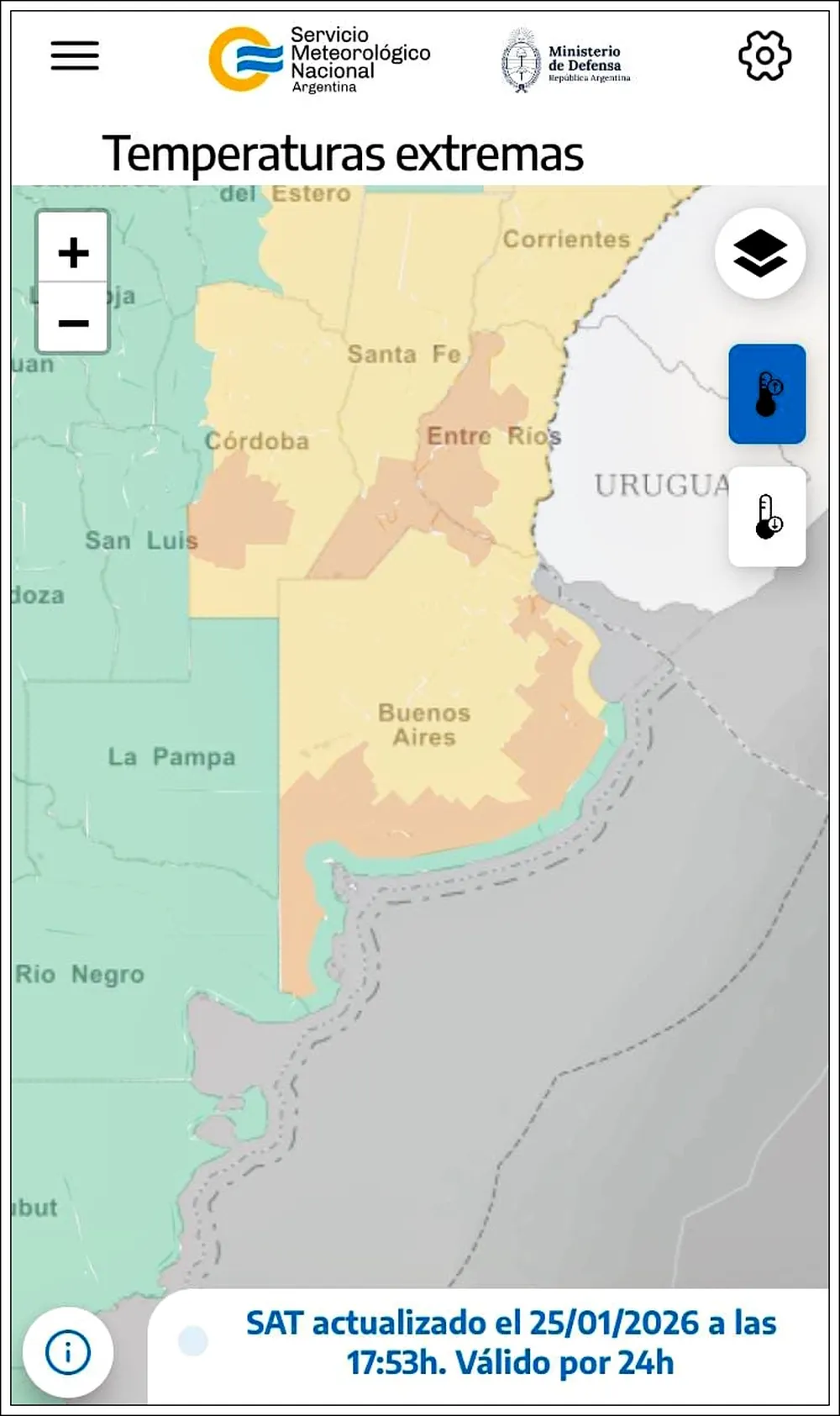 El Servicio Meteorológico Nacional mantiene vigentes alertas de nivel naranja y amarillo por temperaturas extremas sobre nueve provincias argentinas. En el caso de la provincia de Buenos Aires, a excepción de una franja costera, todo el territorio está afectado por la ola de calor.