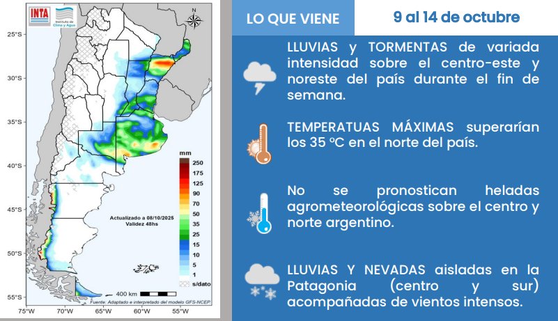 El informe Agromet semanal del INTA, emitido el 8 de octubre de 2025, señala que se esperan lluvias y tormentas de variada intensidad sobre el centro-este y noreste del país durante los próximos días. En particular, el organismo destaca que en sectores de la región pampeana podrían registrarse acumulados de entre 50 y 100 milímetros, con mayor impacto en el noreste bonaerense y el sur de Santa Fe.