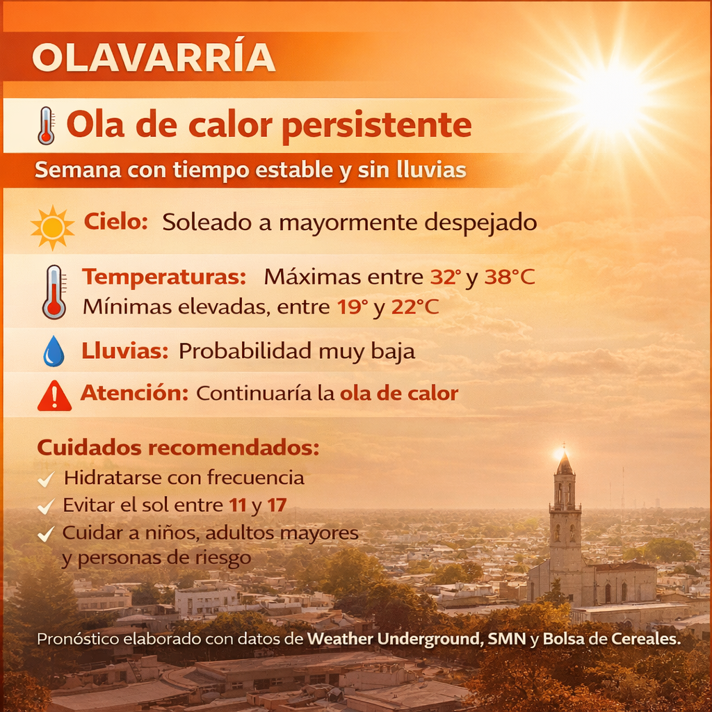 De acuerdo a la integración de información proveniente de Weather Underground, el Servicio Meteorológico Nacional (SMN) y la Bolsa de Cereales, Olavarría se encuentra durante la semana próxima ante un escenario de tiempo estable, con predominio de sol y valores térmicos muy por encima de los promedios normales para esta época del año.