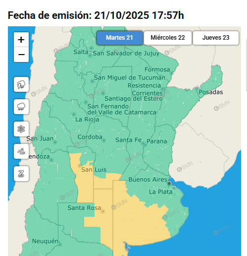 El Servicio Meteorológico Nacional (SMN) emitió en la tarde de este martes 21 de octubre un alerta de nivel amarillo por tormentas que abarca el centro de la provincia de Buenos Aires, incluyendo a Olavarría, Laprida y General La Madrid. Según el informe oficial, las condiciones comenzarán a desmejorar hacia la noche, con la formación de núcleos de lluvia intensa y descargas eléctricas que podrían mantenerse durante la madrugada del miércoles.