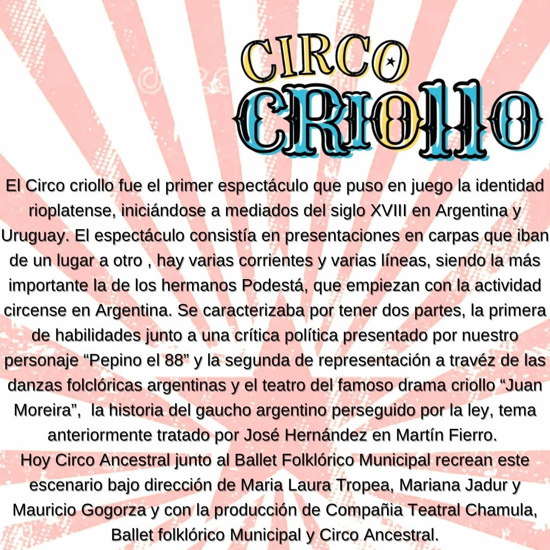 El circo criollo se consolidó como un espectáculo identitario en la región rioplatense. El fenómeno cultural surgió a mediados del siglo XVIII en el territorio que hoy comprenden Argentina y Uruguay. Las fuentes históricas vinculan esa tradición con los hermanos Podestá y con las carpas itinerantes.
