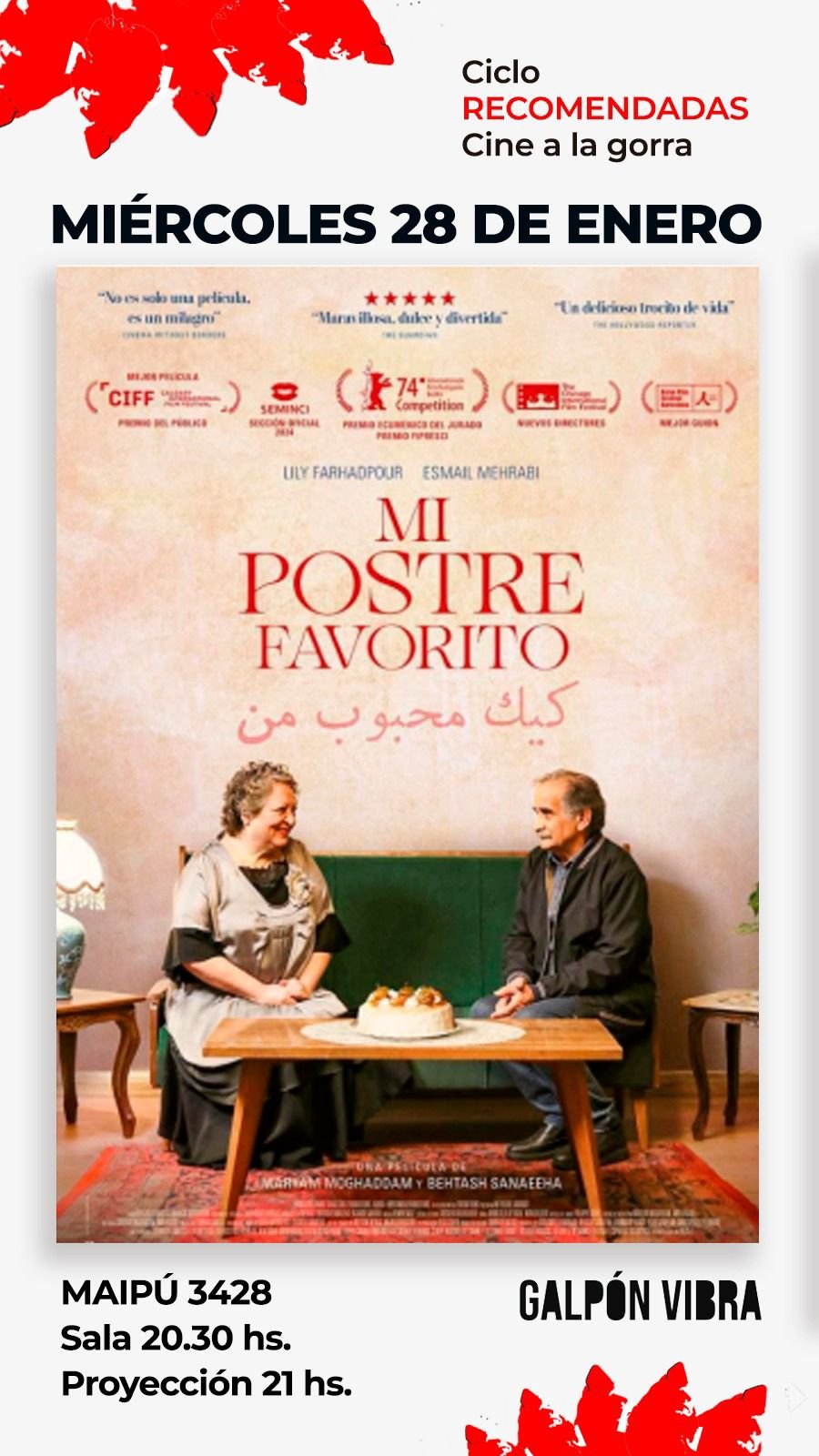 La propuesta cultural culmina el miércoles 28 con Mi postre favorito, una aclamada producción iraní. La modalidad es a la gorra y busca garantizar el acceso al cine independiente y de calidad para toda la comunidad.