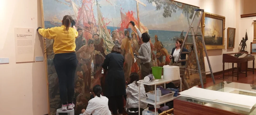 La Armada española anunció que logró restaurar el cuadro Primer homenaje a Cristobal Colón, obra de José Garnelo, que fue atacado este domingo con pintura roja biodegradable por dos activistas del movimiento Futuro Vegetal en protesta por la celebración de la Fiesta Nacional, tras lo que fueron detenidas por la Policía Nacional.