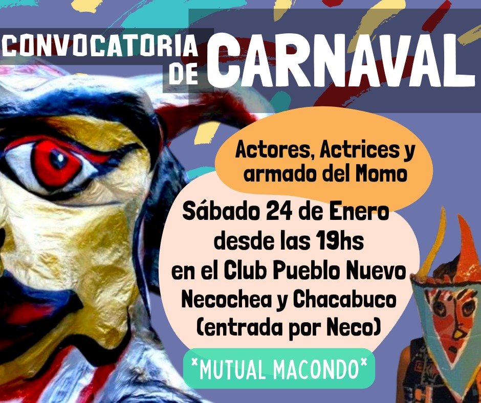 La reunión organizativa se realizará el sábado 24 de enero, a las 19 horas, en las instalaciones del Club Pueblo Nuevo, ubicado en la intersección de Necochea y Chacabuco. Se trata de un primer encuentro abierto, pensado para compartir ideas, sumar propuestas y comenzar a delinear colectivamente el carnaval 2026.