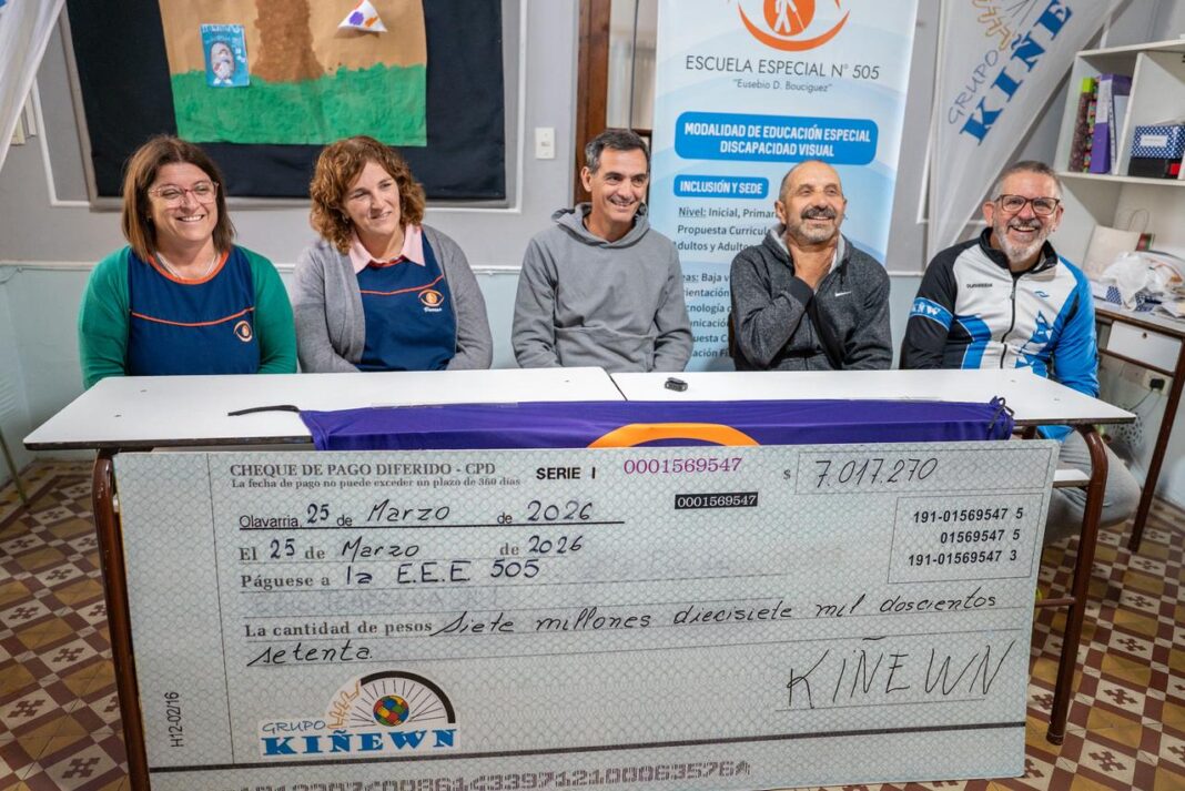 En la mañana de este lunes se realizó la entrega simbólica del cheque con lo recaudado en la última edición de la carrera solidaria Kiñew, que tuvo por segundo año consecutivo como beneficiaria a la Escuela Especial Nº 505 “Eusebio D. Bouciguez” de Olavarría.