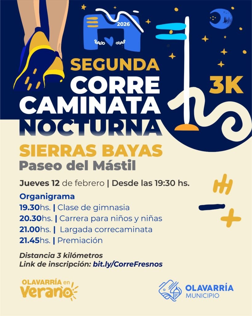 El Municipio de Olavarría, a través de la Subsecretaría de Deportes, anunció que el próximo 12 de febrero se llevará a cabo la segunda Correcaminata Nocturna del 2026, que tendrá como sede la localidad de Sierras Bayas.