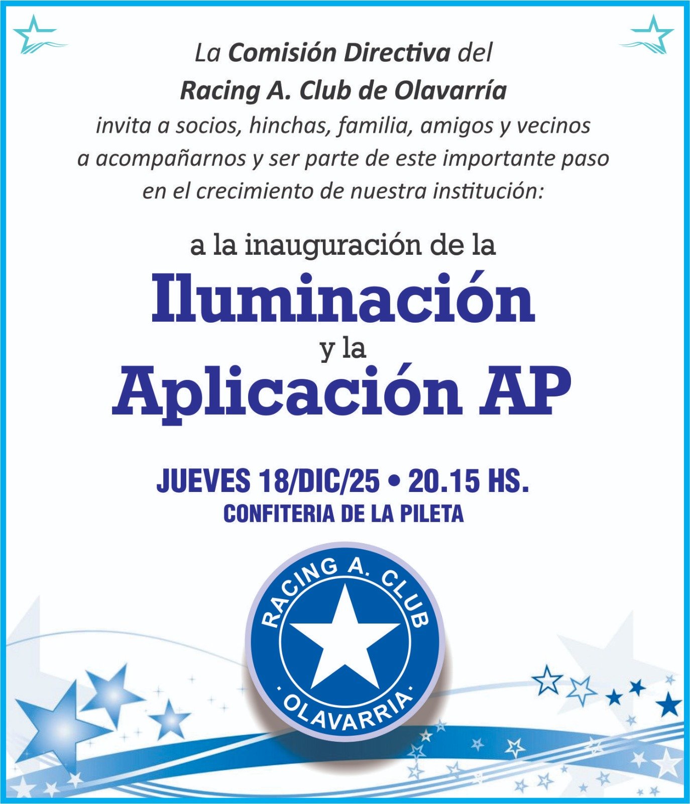 La Comisión Directiva del Racing Athletic Club invita a la comunidad a un acto institucional que marcará un hito en la modernización del club. El evento se desarrollará este jueves 18 de diciembre, a las 20.15, en la Confitería de la Pileta.