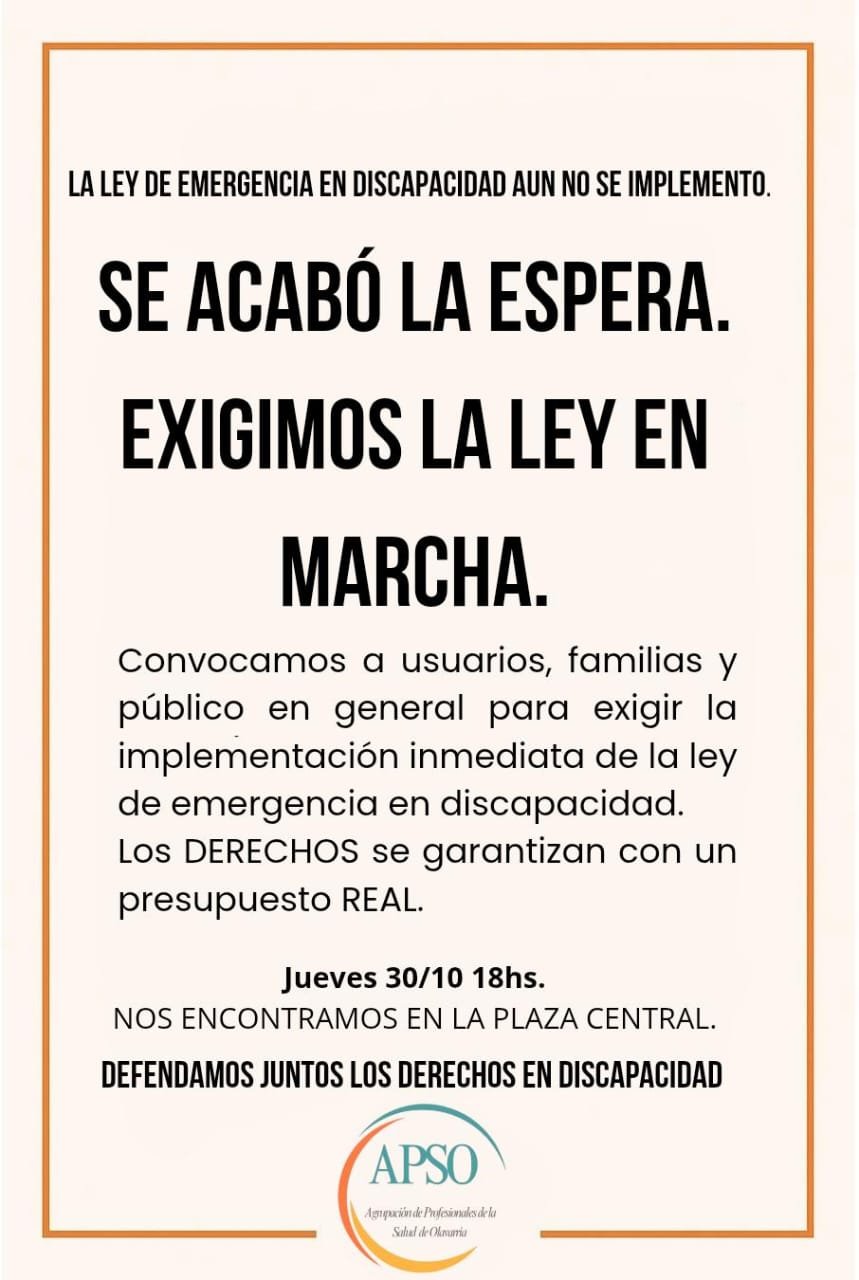 La Agrupación de Profesionales de la Salud de Olavarría (APSO) convoca a una concentración y paro de actividades para reclamar la implementación efectiva de la Ley de Emergencia en Discapacidad.