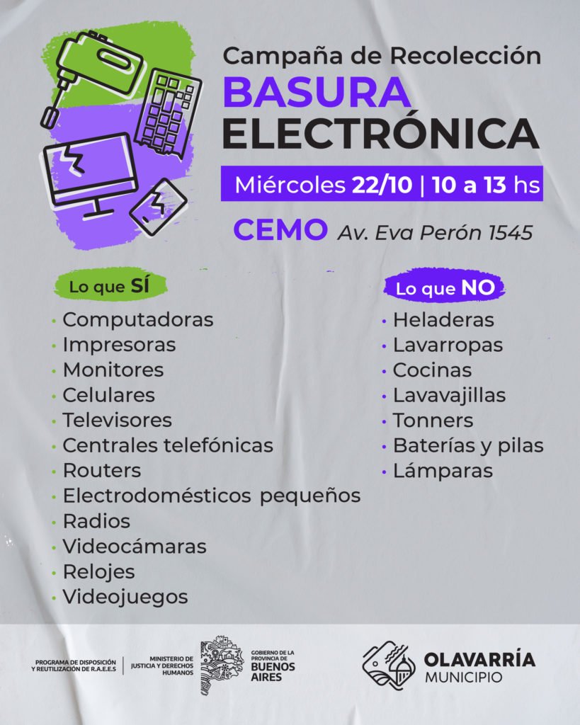 El Municipio de Olavarría, a través de la Coordinación de Ambiente de la Secretaría de Desarrollo Económico y Productivo, informa que la próxima edición de la Campaña de Recolección de RAEEs (Residuos de Aparatos Eléctricos y Electrónicos), se realizará el día miércoles 22 de octubre.