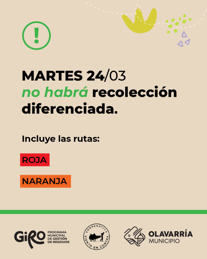 El Municipio de Olavarría, a través del área de Ambiente, informa que, con motivo del feriado en conmemoración del Día Nacional de la Memoria por la Verdad y la Justicia, el próximo martes 24 de marzo no se brindará el servicio de recolección diferenciada de materiales reciclables en el marco del Programa de Gestión Integral de Residuos (GIRO).