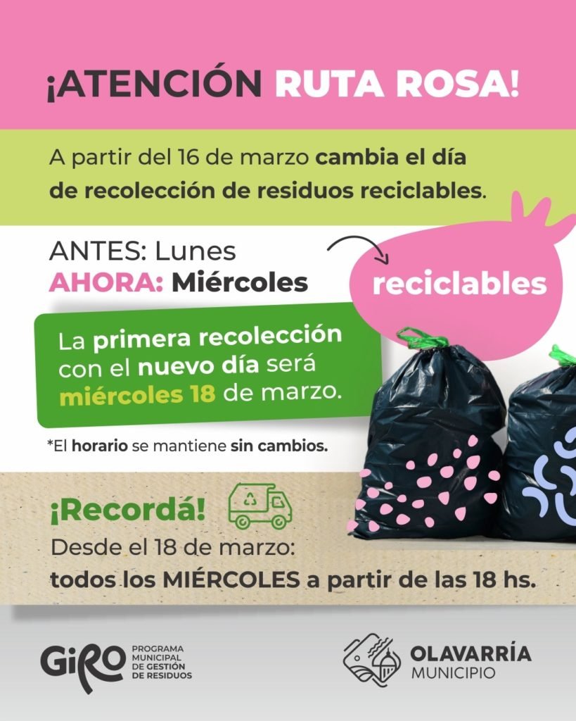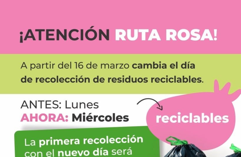 De acuerdo con lo que se detalló, a partir de la semana del 16 de marzo la denominada “Ruta Rosa” comenzará a tener la recolección de materiales reciclables los días miércoles, a partir de las 18 horas. Vale recordar que hasta esa feche lo tenía los días lunes.