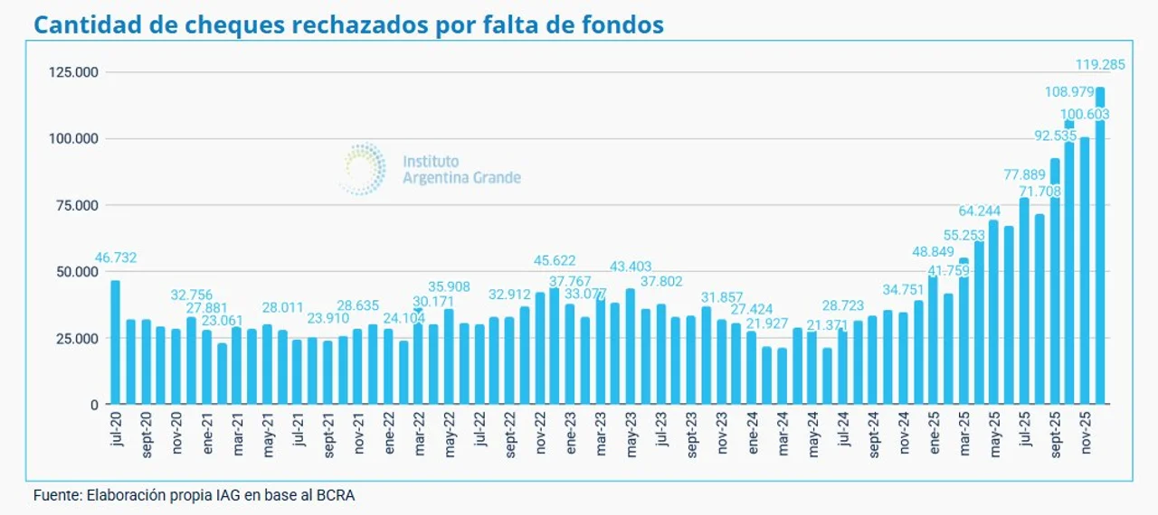 La velocidad del deterioro financiero es el dato que más preocupa a los analistas. Según el documento, la cantidad de cheques sin fondos «se triplicó en un año», marcando un aumento del 200% respecto a las cifras de diciembre de 2024.