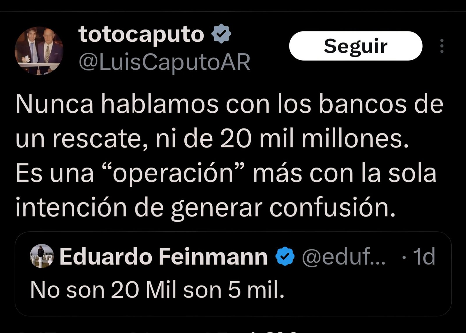 En su publicación, Caputo compartió además un video de una entrevista de octubre, donde había adelantado que el equipo económico trabajaba en “otra facilidad por otros 20.000 millones de dólares”, en referencia a la línea de crédito que ahora quedó descartada.
