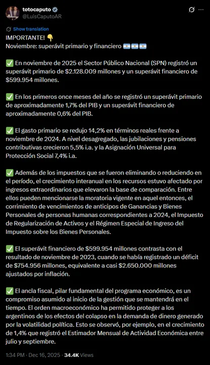 “El superávit financiero de $599.954 millones contrasta con el resultado de noviembre de 2023, cuando se había registrado un déficit de $754.956 millones, equivalente a casi $2.650.000 millones ajustados por inflación”.