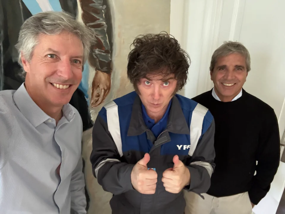 Lo dijo en su cuenta de X al postear una foto en la cual se lo ve junto a Milei, vestido con un mameluco de YPF, y a Bausili. (NA)