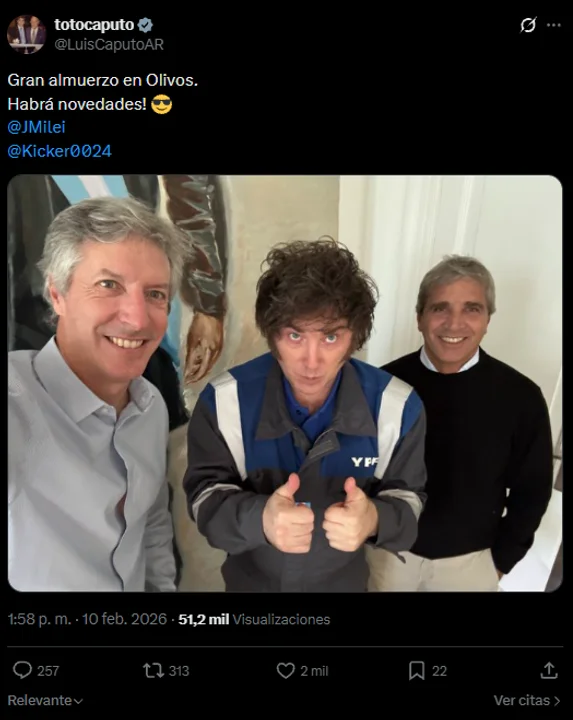 Lo hizo en su cuenta de X tras almorzar con Milei y el presidente del Banco Central.