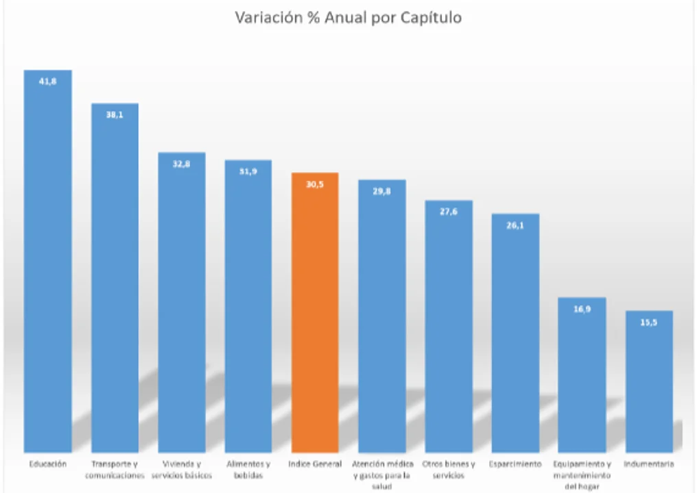 Al analizar el comportamiento por rubros, Educación fue el capítulo que acumuló la mayor suba anual (41,8%), impulsado principalmente por los aumentos en las matrículas de los colegios privados, seguido por Transporte y comunicaciones con un 38,1%.