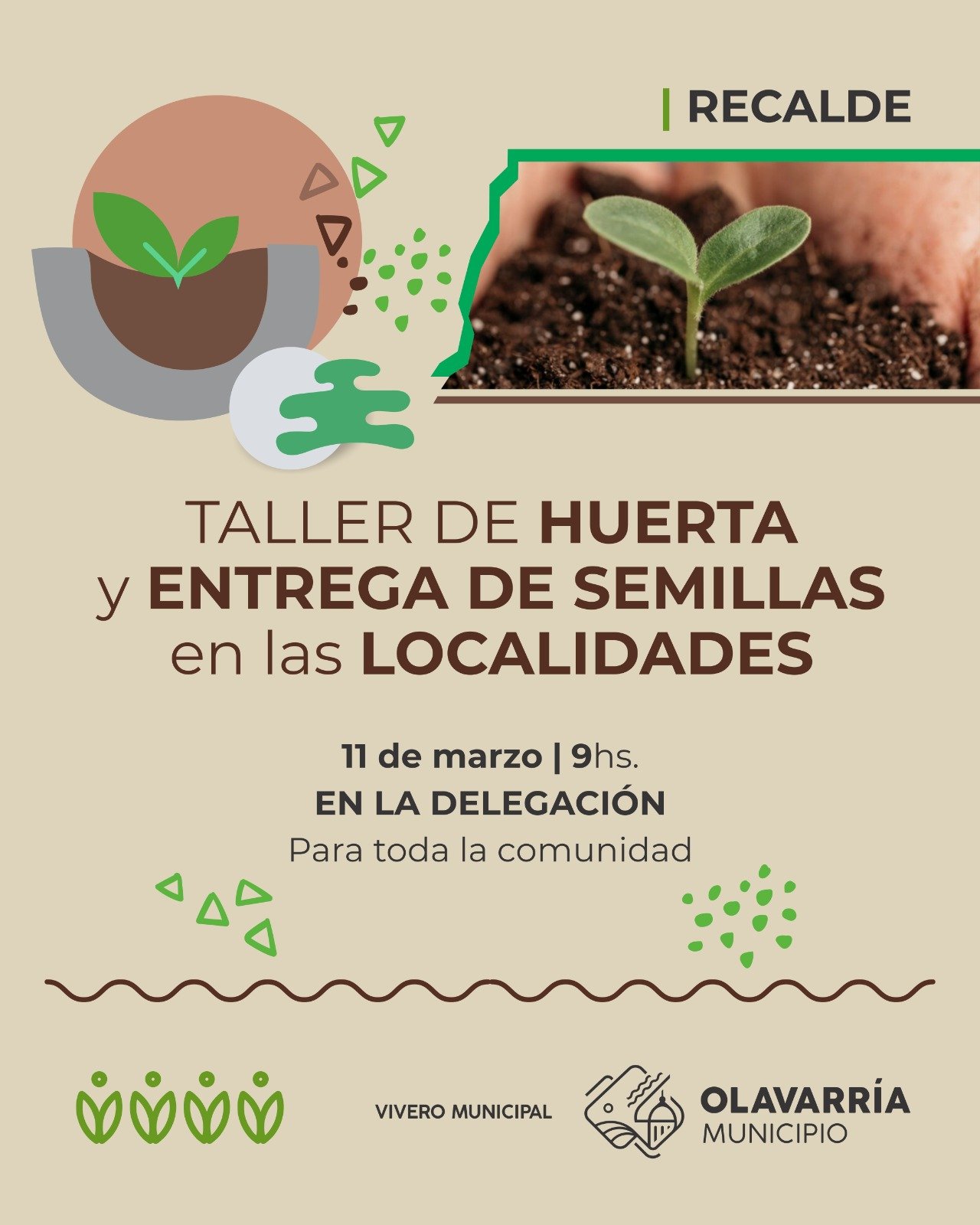 El Municipio de Olavarría invita a la comunidad de Recalde y Espigas a participar de los talleres de Huerta que se realizarán durante la corriente semana en las mencionadas localidades, espacios que son promovidos desde la Dirección de Desarrollo Agropecuario de la Secretaría de Desarrollo Económico y Productivo. En la ocasión, además, se realizará entrega de semillas de estación en el marco de la continuidad del Programa Municipal que surgió para dar respuesta en la materia ante la decisión del Gobierno Nacional de abandonar el programa Pro Huerta a través del INTA.