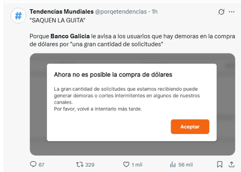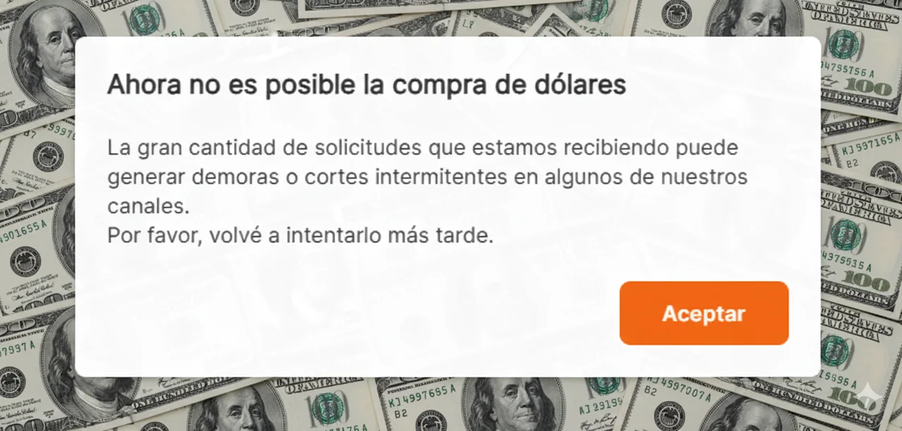 El mensaje del banco, que se viralizó en cuestión de minutos, advertía: «Ahora no es posible la compra de dólares. La gran cantidad de solicitudes que estamos recibiendo puede generar demoras o cortes intermitentes en algunos de nuestros canales. Por favor, volvé a intentarlo más tarde».