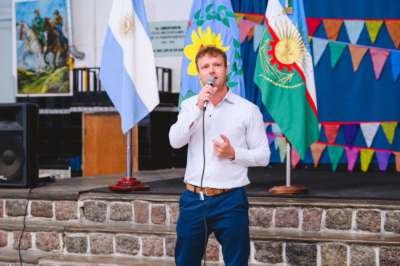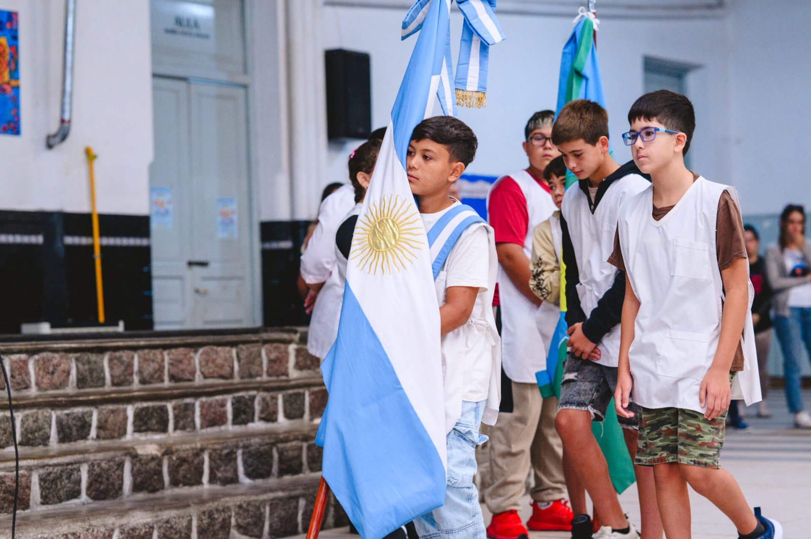 La actividad comenzó puntualmente a las 8:00 hs en la esquina de Chacabuco y San Martín. El momento más emotivo se vivió durante el izado del pabellón nacional, donde alumnos e integrantes de la comunidad escoltaron a Alberto Vicente Puglisi, un exestudiante de 101 años invitado especialmente para la ocasión.