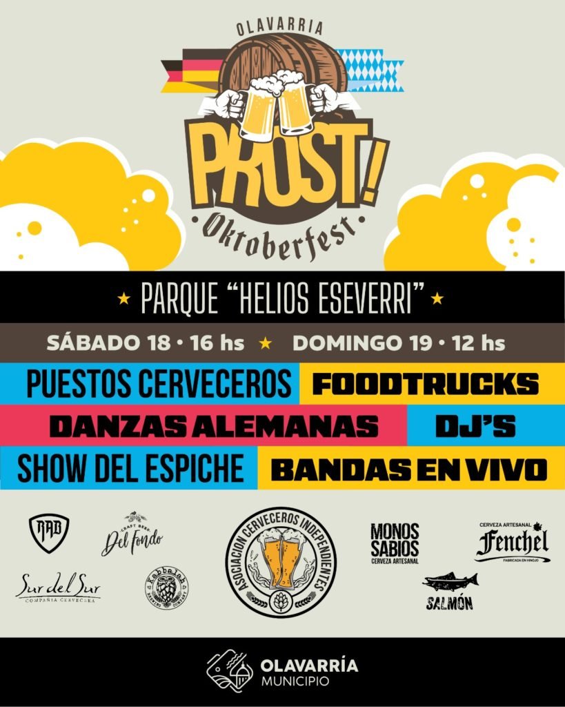Con el acompañamiento del Municipio de Olavarría, se invita a la comunidad a disfrutar de la mejor cerveza de las fábricas Kabbalah, Sur del Sur, Monos Sabios, Fenchel, RAB, Salmón y el show del Espiche (la apertura explosiva del primer barril de la fiesta) con bandas, DJs y números de danzas alemanas. La entrada será libre y gratuita.