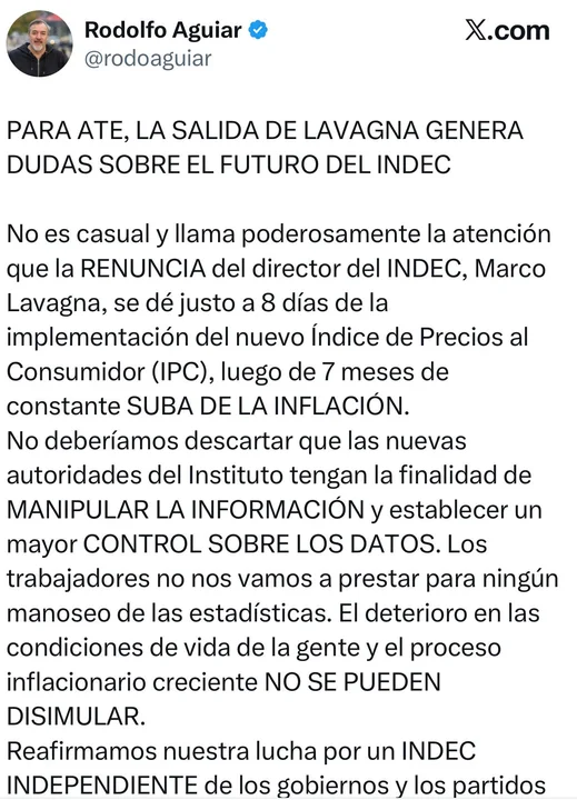 El secretario general de ATE, Rodolfo Aguiar, sostuvo este lunes que la renuncia de Marco Lavagna al INDEC “genera dudas sobre el futuro» del organismo y consideró “no es casual” que se produzca “justo a ocho días de la implementación del nuevo Índice de Precios al Consumidor (IPC), luego de siete meses de constante suba de la inflación”.
