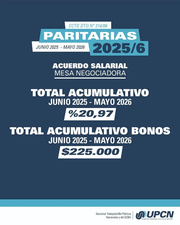UPCN destacó que entre junio de 2025 y mayo de 2026  al aumento acumulado fue de 20,97 por ciento, mientras que el total acumulativo por bonos fue de 225.000 pesos.