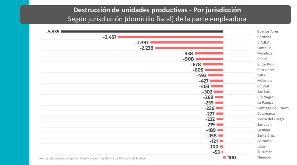 De acuerdo a estas cifras, unas 232 compañías cerraron por mes desde el inicio de la gestión libertaria, o medido por día serían 8 firmas que no pudieron seguir operando. “Aunque el impacto fue generalizado -con la excepción de Neuquén-, la PBA concentra más daño por su estructura productiva: aporta casi el 50% del valor industrial del país”, explicó el funcionario, quien recodó que 3 de cada 10 empresas que cerraron en el país estaban instaladas en territorio bonaerense.