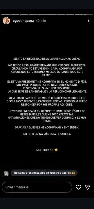 “No tengo absolutamente nada que ver con lo que está circulando. Yo estuve en mi casa acompañada por amigos que estuvieron a mi lado todo este tiempo. Él (su padre) estuvo presente y me acompañó en el momento difícil que pasé. No puedo ni me corresponde responsabilizarme por sus actos”, expresó la joven de 29 años.