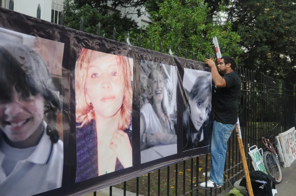Las cuatro víctimas de la masacre, en un mural que se colgó en los tribunales en 2014. Foto: Archivo Télam
