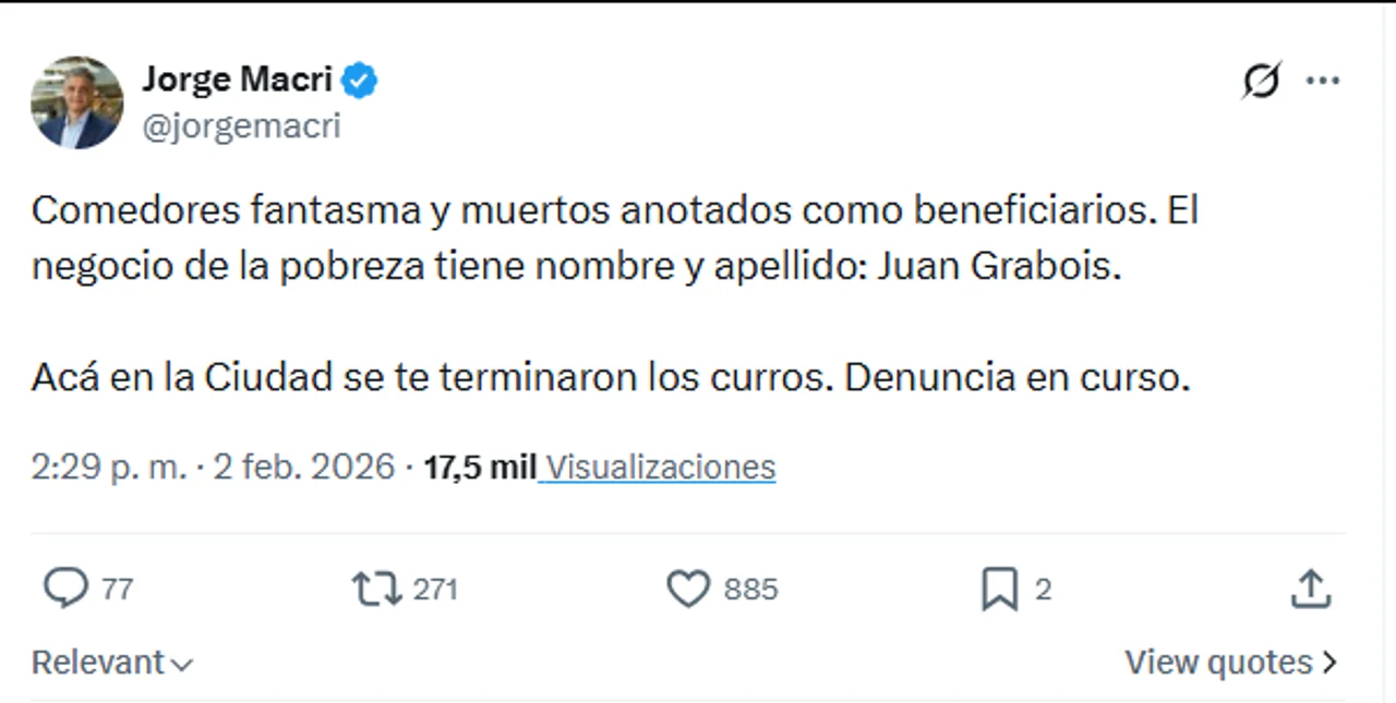 “Comedores fantasma y muertos anotados como beneficiarios. El negocio de la pobreza tiene nombre y apellido: Juan Grabois”, embistió el mandatario porteño.