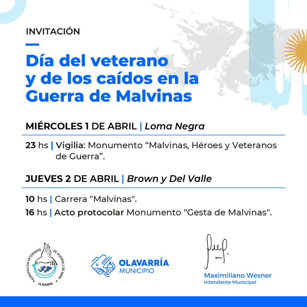 El Municipio de Olavarría invita a la comunidad a participar del acto protocolar en el marco de la conmemoración del Día del Veterano y de los Caídos en la Guerra de Malvinas, que se llevará a cabo este jueves 2 de abril, a las 16 horas, en el Monumento “Gesta de Malvinas” (Av. Del Valle y Brown).