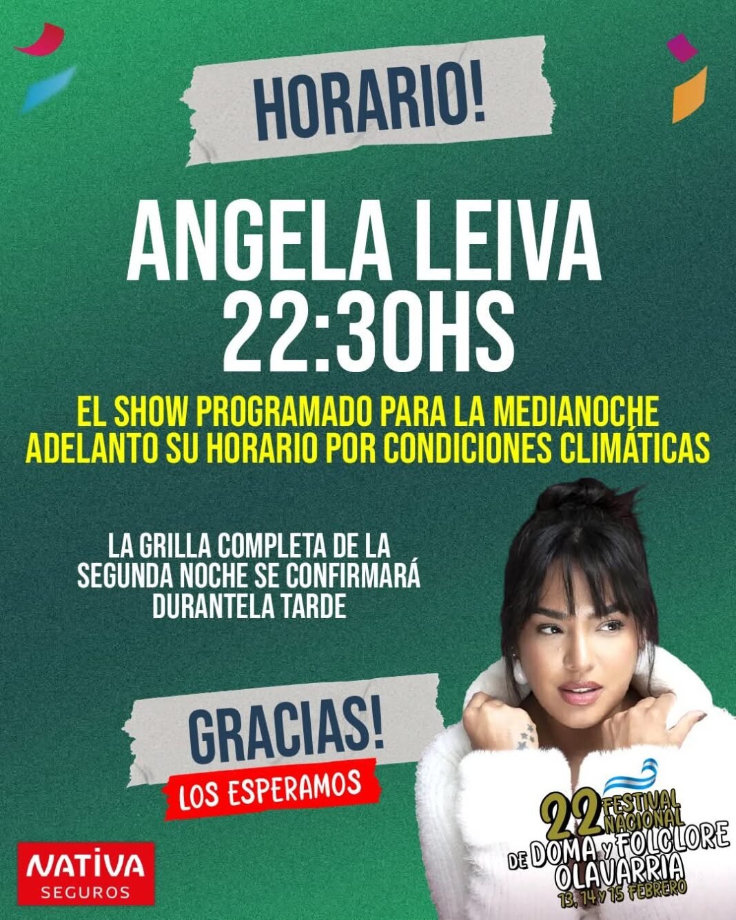 La Comisión Organizadora del Festival Nacional de Doma y Folclore informó una modificación en el horario del espectáculo central de este sábado 14 de febrero, a raíz de los pronósticos meteorológicos desfavorables previstos para la noche en Olavarría.