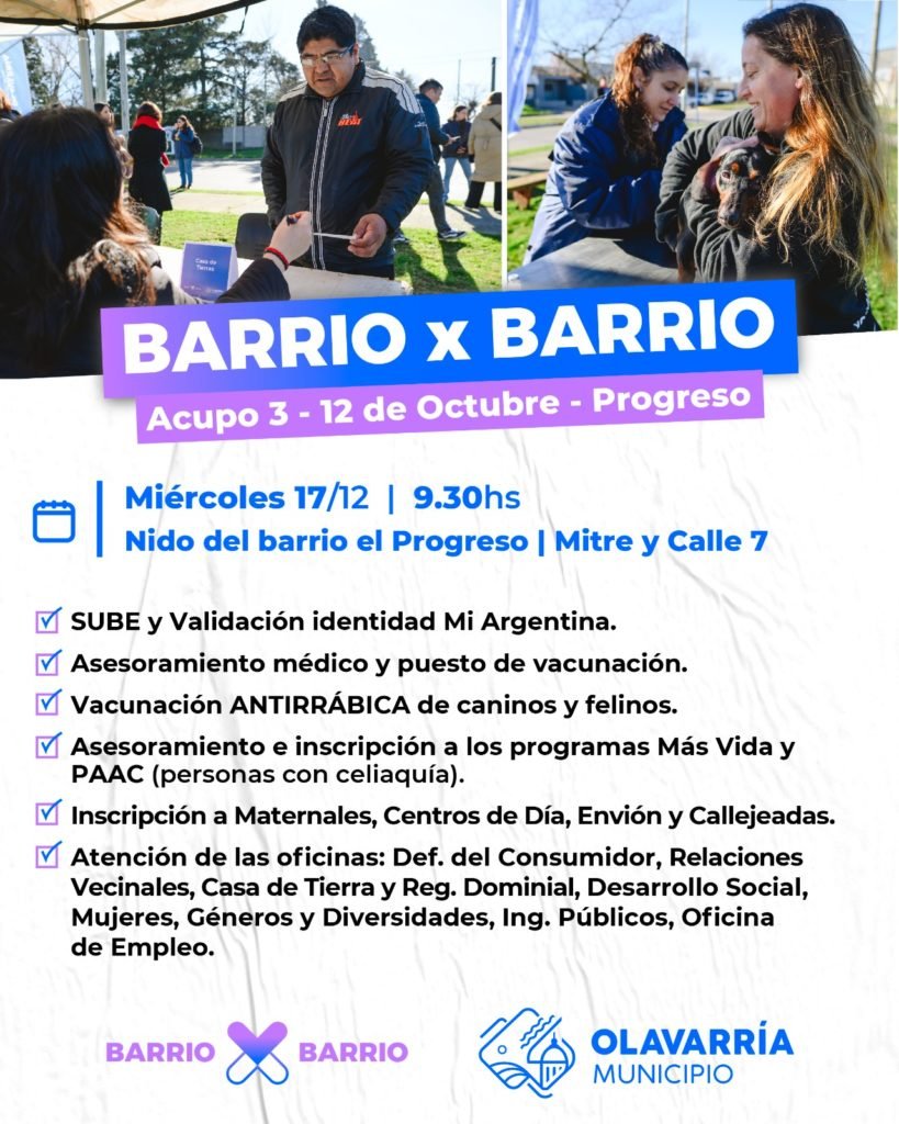 Este miércoles 17 de diciembre, a partir de las 9:30 horas, se llevará a cabo la última edición del año del programa “Barrio por Barrio”, el dispositivo de abordaje territorial integral del Municipio de Olavarría que ha marcado una fuerte presencia en todo el Partido durante el 2025. La jornada de cierre tendrá como punto central el NIDO del barrio El Progreso, ubicado en Mitre y Calle 7, extendiendo su acción también a los barrios Acupo 3 y 12 de Octubre.