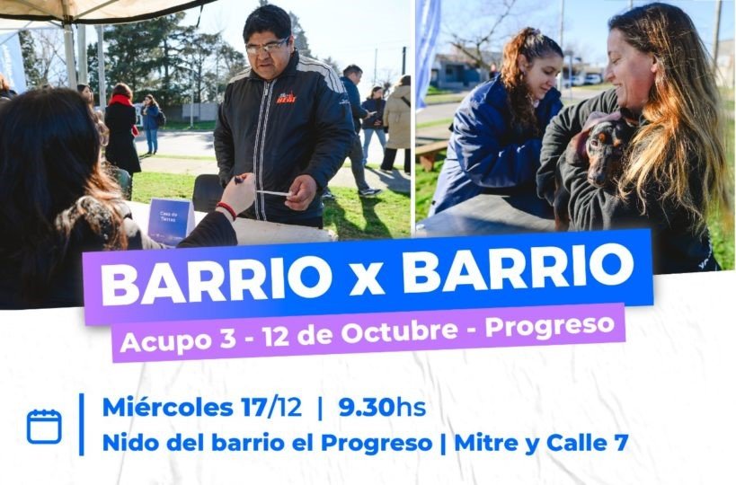 Este miércoles 17 de diciembre, a partir de las 9:30 horas, se llevará a cabo la última edición del año del programa “Barrio por Barrio”, el dispositivo de abordaje territorial integral del Municipio de Olavarría que ha marcado una fuerte presencia en todo el Partido durante el 2025. La jornada de cierre tendrá como punto central el NIDO del barrio El Progreso, ubicado en Mitre y Calle 7, extendiendo su acción también a los barrios Acupo 3 y 12 de Octubre.