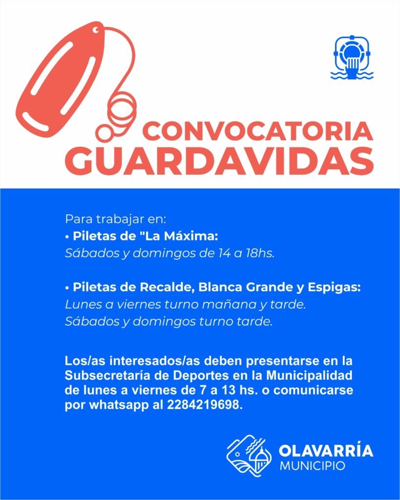 El Municipio de Olavarría, a través de la Subsecretaría de Deportes, lanzó una convocatoria para guardavidas que deseen desempeñar tareas durante la próxima temporada de verano en diversos espejos de agua del Partido.
