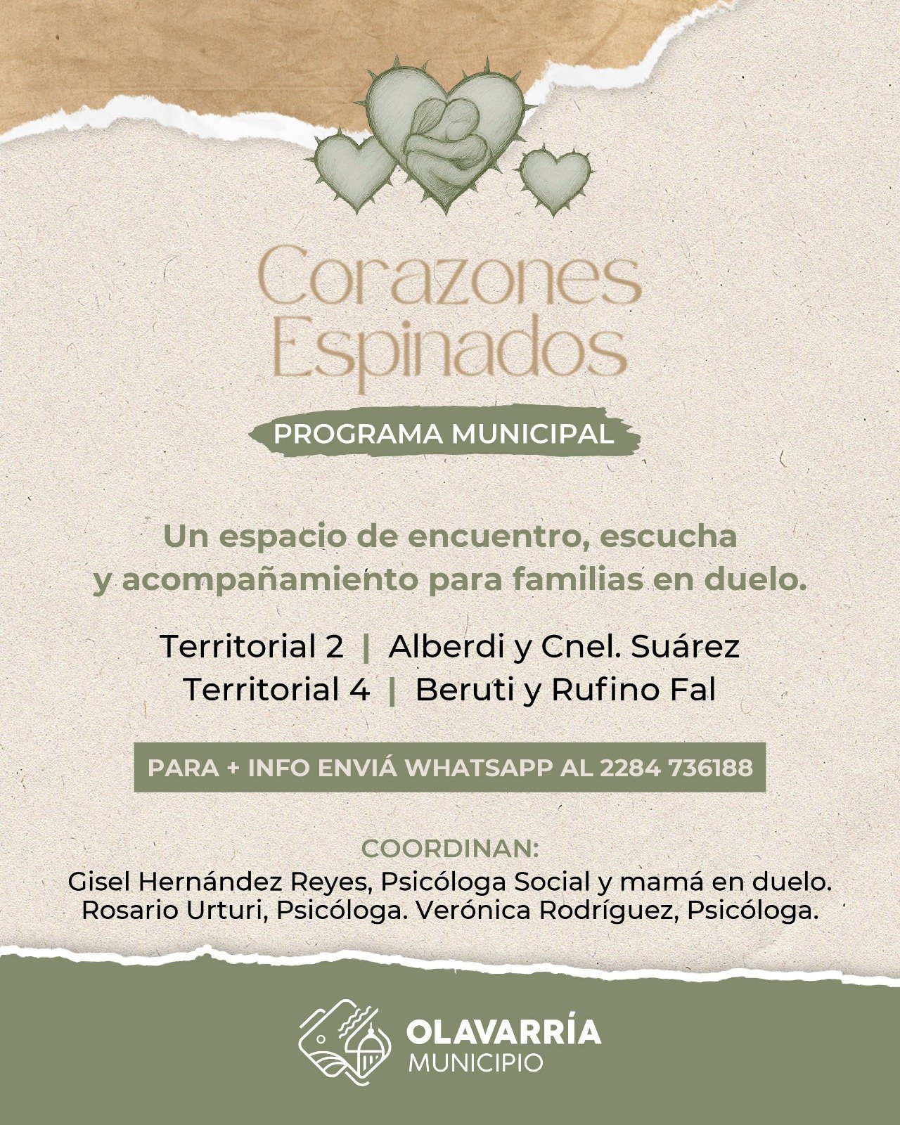 El Municipio de Olavarría brinda a la comunidad el espacio de acompañamiento “Corazón Espinado”, una iniciativa destinada a personas que han perdido un hijo o hija. Se trata de encuentros presenciales y abiertos, que se desarrollan de manera regular en espacios municipales y tienen como objetivo principal ofrecer contención, escucha y acompañamiento en un proceso profundamente doloroso. La propuesta cuenta con la supervisión del Servicio de Salud Mental.