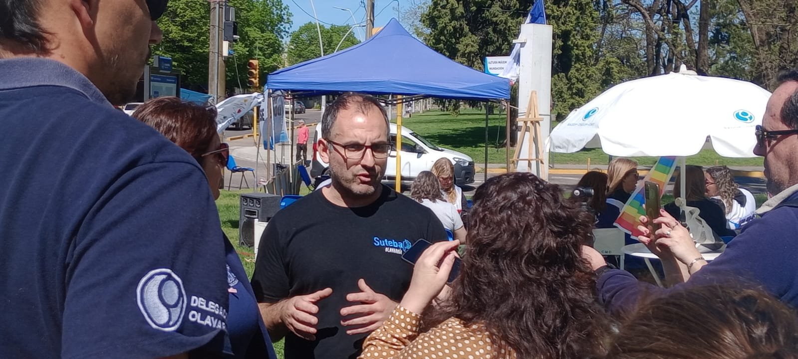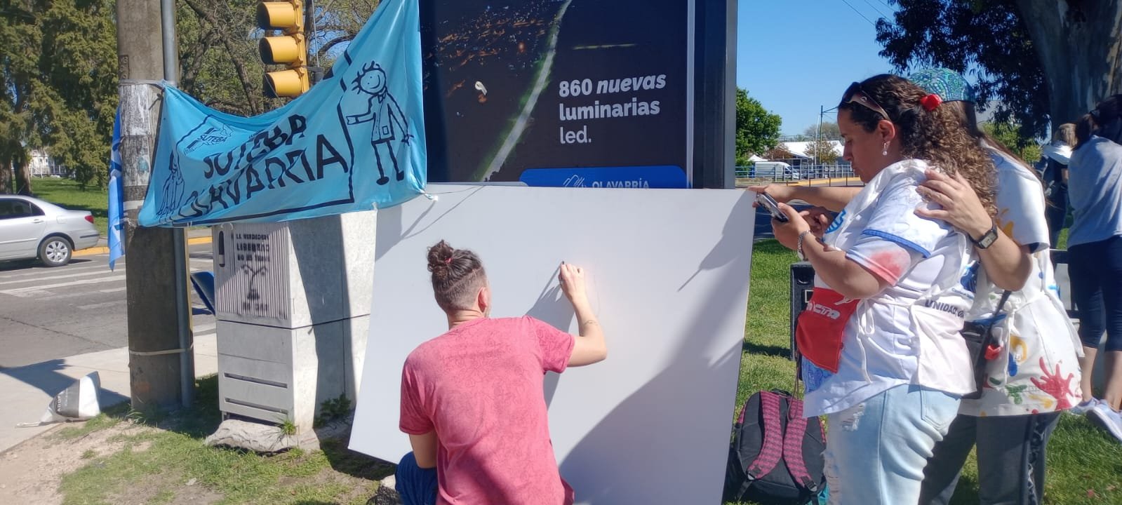 Desde las 10 y hasta las 15, referentes sindicales del sector estuvieron presentes en la zona y realizaron un reparto de panfletos a caminantes, ciclistas y automovilistas que pasaron por el lugar, bajo el lema “La escuela enseña y construye esperanza”.